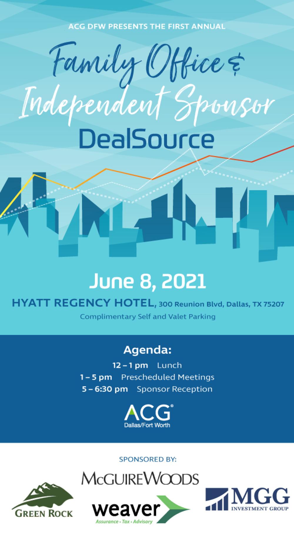 DealSource: Pre-arranged 20 minute meetings between Family Office Groups and Independent Sponsors in a speed dating format.