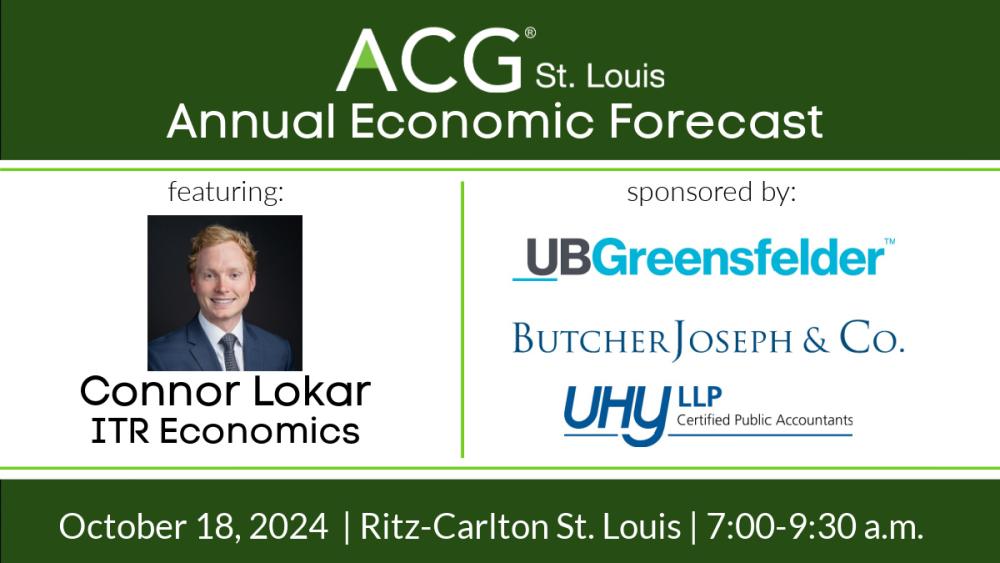 Join ACG St. Louis for the Annual Economic Forecast on Friday, October 18, 2024 at the Ritz. We are proud to welcome back ITR Economics! Thank you to our sponsors: ButcherJoseph & Co., UB Greensfelder and UHY.