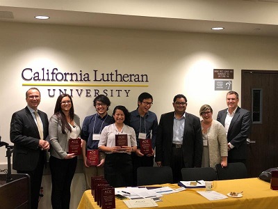 Dr. Gerhard Apfelthaler, Dean, California Lutheran University School of Management (pictured, far left) congratulates the winning team from California Lutheran University. Next to Dr. Apfelthaler are winning teammates Thanapat Sarakhunpradit, Kathryn Feltes, Kenia Guinto, Chonlapob Jongsathitpiboon, and Chris Seto as well as competition judges (pictured at right).