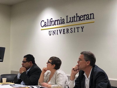 Judges Sumantra Sengupta, Ph.D., MBA Program Director for Cal Lutheran, Laura Azzalina, Vice-President, Calabasas Capital, and Chuck Best, Vice-President Procurement and Facilities, BlackLine (Pictured bottom left) listen carefully to MBA Students as they pitch their ideas.