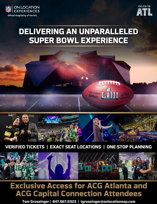Atlanta is the host city for Super Bowl LIII. Come in for the game, work the market, and attend the 2019 Atlanta ACG Capital Connection. Please call Tom Grossinger to get your verified tickets from the NFL.