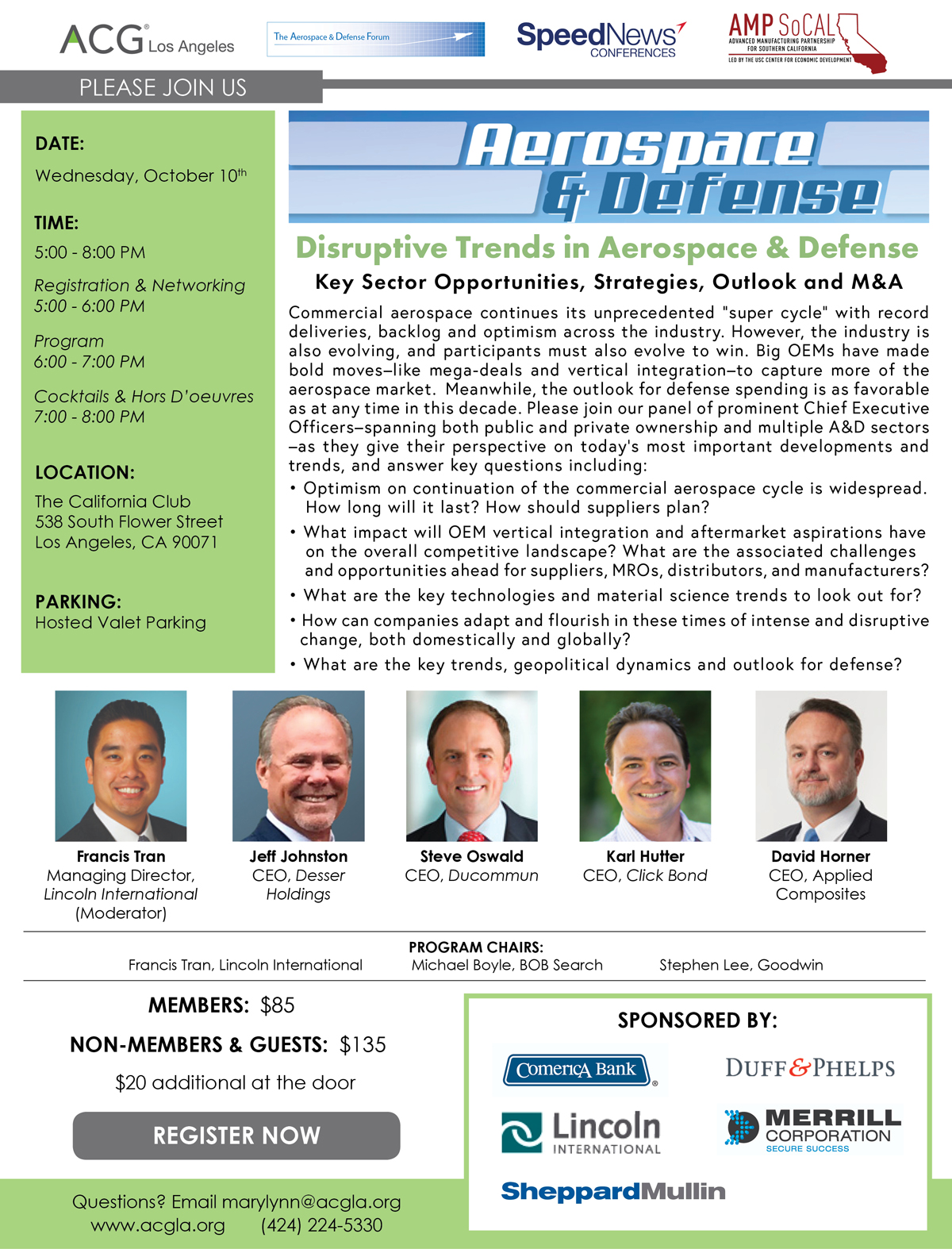 Francis has extensive expertise in advising clients on mergers and acquisitions, capital raising and other strategic advisory assignments globally. His clients include large-cap aerospace and defense corporations, owner entrepreneurs, and A&D-focused private equity firms. Francis has extensive A&D experience working with companies operating in a variety of aerospace & defense subsectors, including aerostructures and components, interiors, aftermarket services / MRO, engineered systems, electronics and composites / advanced materials, among others. Prior to joining Lincoln International in 2011, he worked in a dual role at Barclays Capital in the Financial Sponsors Group while also working to build up the firm’s middle-market investment banking effort. He holds a MBA from UCLA, and dual Bachelor of Arts degrees in Economics and Chemistry from UC Berkeley.