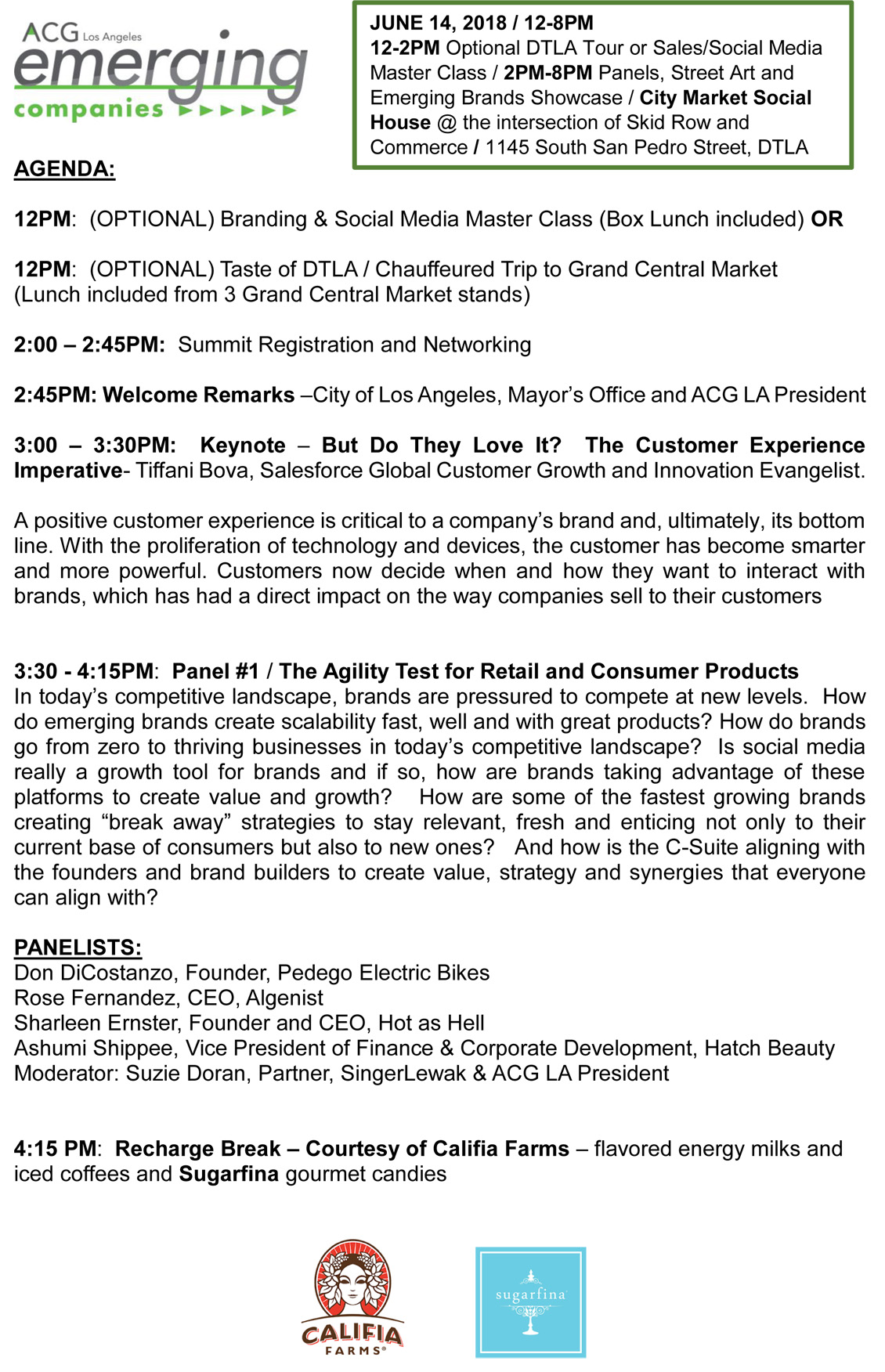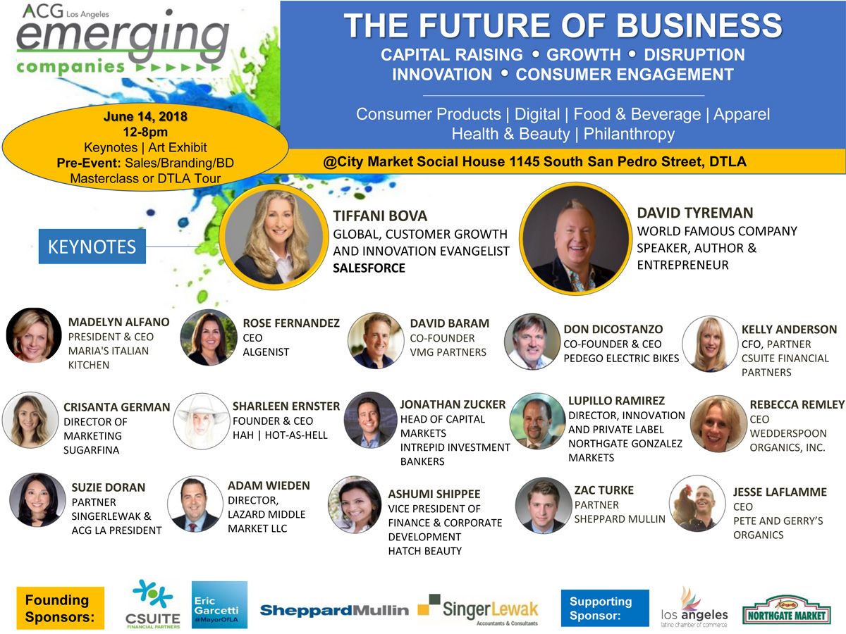 ACG LA is launching an Emerging Companies half day Summit in DTLA. This Summit is designed for the rule breakers, outside the box thinkers, next gen trailblazers and for those who refuse to color inside the business lines. This is YOUR CHANCE to be part of the coolest entrepreneurial event in LA. Sponsorship spots will be reserved on a first come, first serve basis. All of the speakers in the attached document have been invited to speak (some have not responded but our list is epic!).