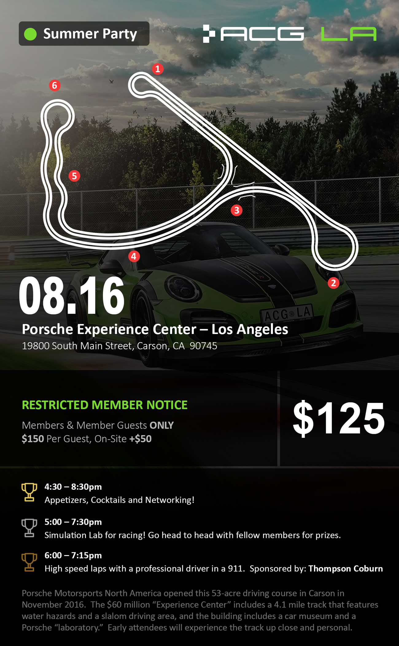 Zero to 60 mph in 3.5 seconds! 100 mph going into the 1st turn. Porsche Motorsports North America opened this 53-acre driving course in Carson in November 2016. The $60 million "Experience Center" includes a 4.1 mile track that features water hazards and a slalom driving area, and the building includes a car museum and a Porsche "laboratory." One of only two in the US. And early attendees will experience the track up close and personal. This is a MEMBERS ONLY Summer Party. Members may bring guests. Members are $125 and their guests are $150. Members only will be allowed to register On-Site the day of the event for an additional $50. Appetizers, cocktails and the simulation lab will go from 4:30 - 8:30 pm. 5:00 - 7:30 pm the Simulation lab is open for racing! Inside the Simulator Lab, members will build a thrilling foundation in driving and racing by virtually experiencing a number of classic Porsche vehicles on famous racing circuits around the world. Go head to head with fellow members for prizes. And from 6:00 - 7:15 pm high speed laps with a professional driver in a 911 - sponsored by Thompson Coburn! Only 60 attendees will experience the ride alongs so come early! The Porsche Experience Center is located at 19800 South Main Street, Carson, CA 90745. August 16th is the PARTY! Register now!