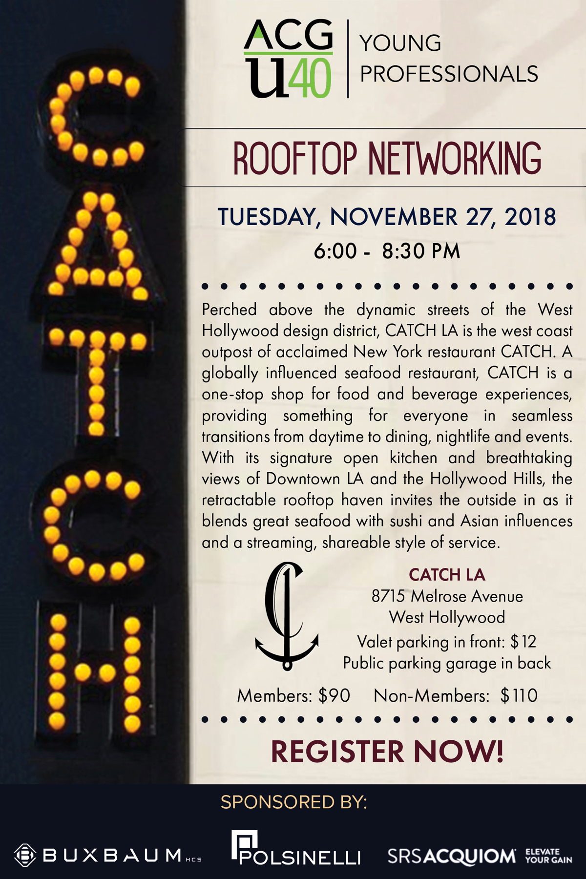 "Perched above the dynamic streets of the West Hollywood design district on the corner of Melrose & San Vicente, CATCH LA is the west coast outpost of acclaimed New York restaurant CATCH. A globally influenced seafood restaurant, with locations in New York, Dubai and Playa del Carmen, CATCH is a one-stop shop for food and beverage experiences, providing something for everyone in seamless transitions from daytime to dining, nightlife and events. With its signature open kitchen and breathtaking views of downtown Los Angeles & the Hollywood Hills, the 340 seat retractable rooftop haven invites the outside in as it blends great seafood with sushi and Asian influences and a streaming, shareable style of service with a unique, open-air dining room and elevated, interactive atmosphere." From CATCH homepage 2018