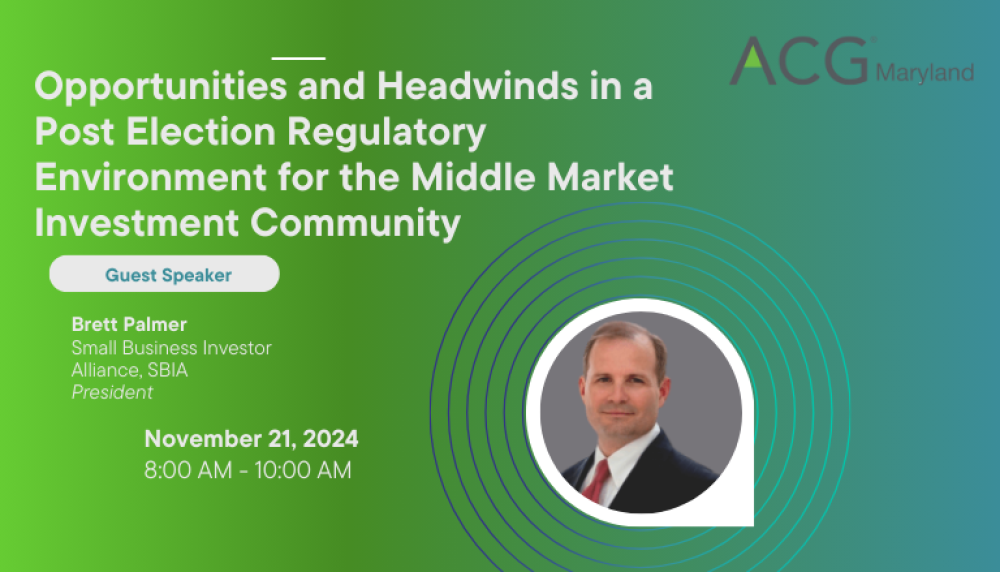 SBIA's President, Brett Palmer will join the ACG Maryland Chapter to discuss the opportunities and headwinds in a post election regulatory environment. Gain insights on what these opportunites will mean for the middle market investment community. Enjoy breakfast and networking with your fellow ACG Maryland members.