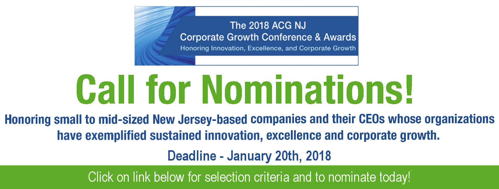 Nominations are now being accepted for the 2018 ACG NJ Corporate Growth Awards for top performing companies who meet our selection criteria!