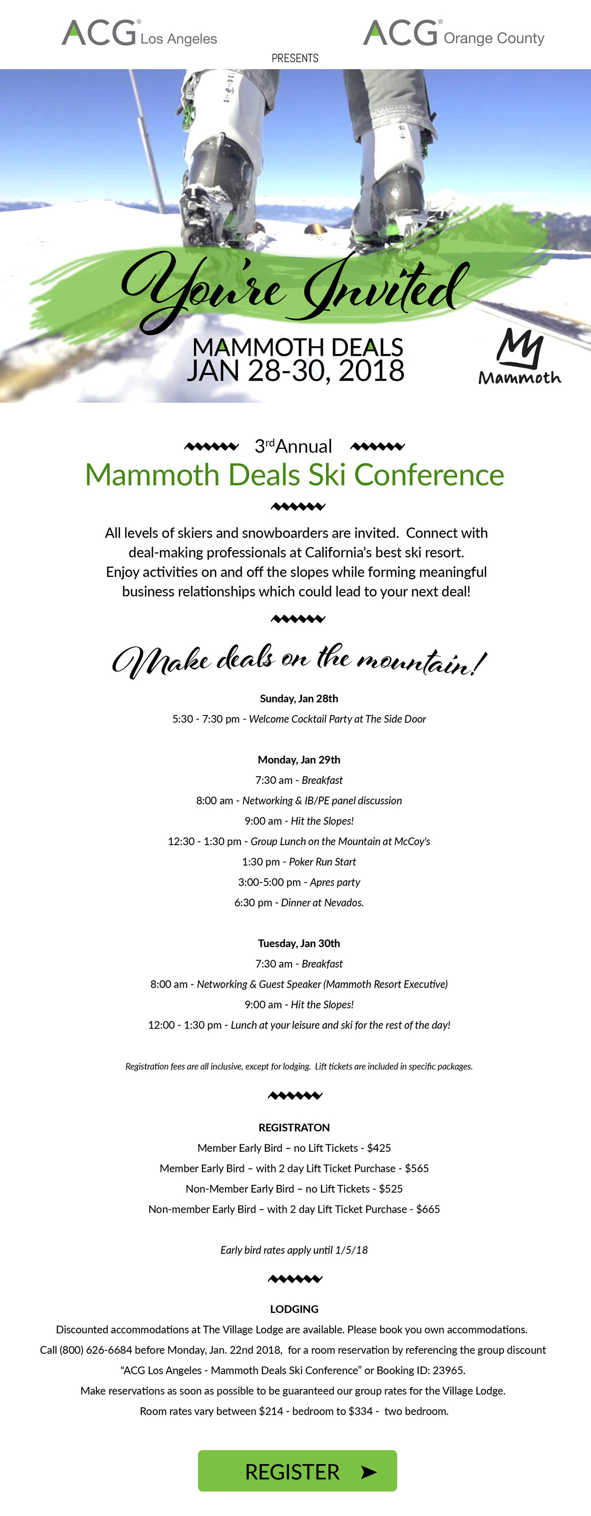 Our conference is providing discounted accommodations at The Village Lodge. Please book you own accommodations by calling 1(800) 626-6684 before Monday, Jan. 22nd 2018, for a room reservation. Reference the group discount ACG Los Angeles - Mammoth Deals Ski Conference or booking ID: 23965. www.VillageAtmammoth.com