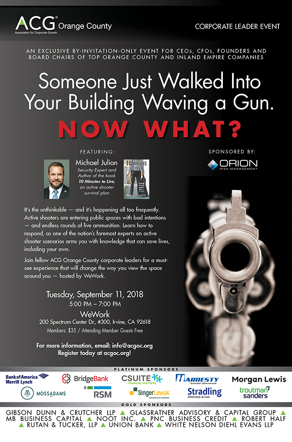 It's the unthinkable - and it's happening all too frequently. Active shooters are entering public spaces with bad intentions - and endless rounds of live ammunition. Learn how to respond, as one of the nation's foremost experts on active shooter scenarios arms you with knowledge that can save lives, including your own. Join fellow ACG Orange County corporate leaders for a must-see experience that will change the way you view the space around you. Hosted by WeWork.
