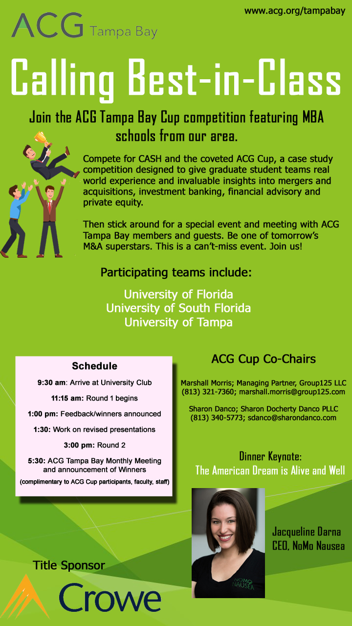 The ACG Cup is a case study competition designed to give students from leading MBA programs across the country invaluable insights into mergers and acquisitions, investment banking, financial advisory and private equity. The competition is carried out through a series of intra-school competitions, with each university bringing their top three teams to the University Club in downtown Tampa on Thursday, March 28, 2019 for both the Round One and Final Round. The prestigious ACG Tampa Bay Cup title and cash awards will be given.