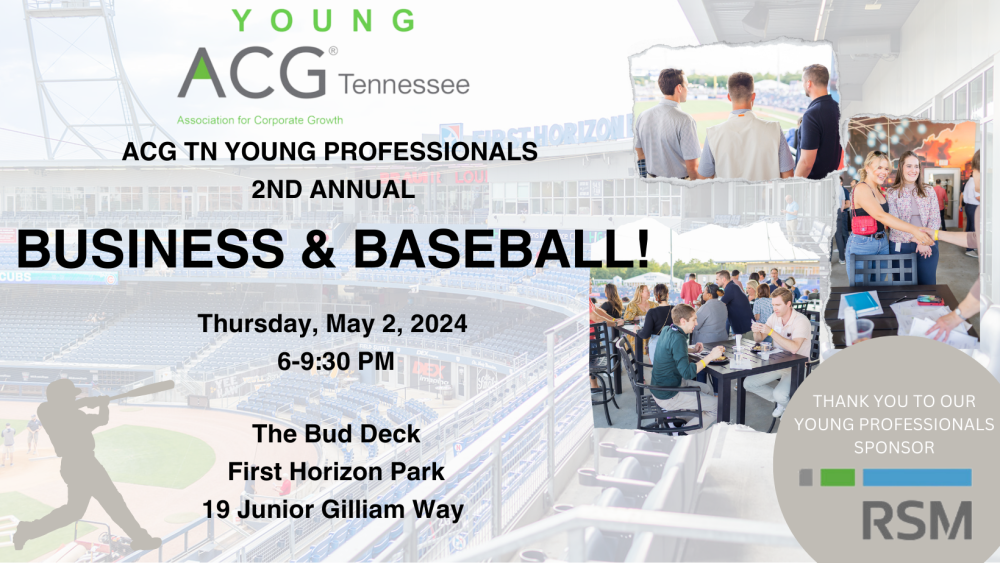 ACG TN Young Professionals cordially invite other Young Professionals to join us for our second annual "Business & Baseball" event on Thursday, May 2, 2024, sponsored by RSM. Build and stregthen your business network and friendships while enjoying a great atmoshphere, and plenty of picnic fare and beverages.