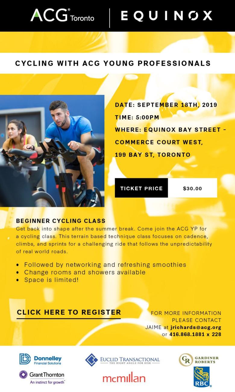 Get back into shape after the summer break! Come join the ACG YP for a cycling class. This terrain based technique class focuses on cadence, climbs, and sprints for a challenging ride that follows the unpredictability of real world roads.